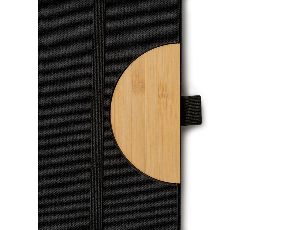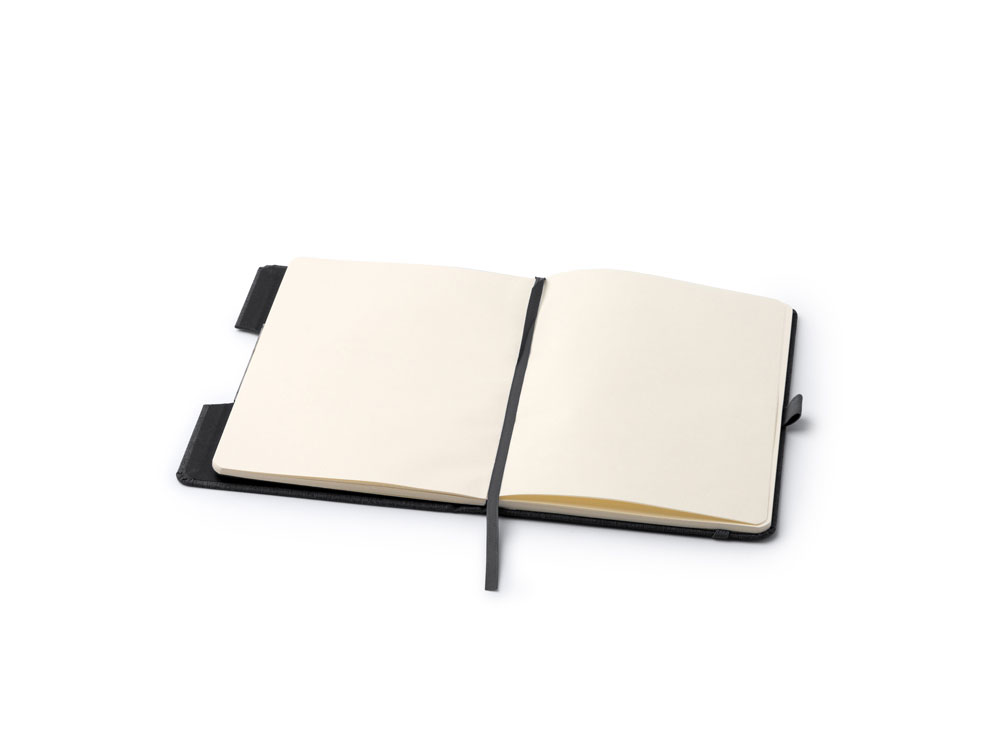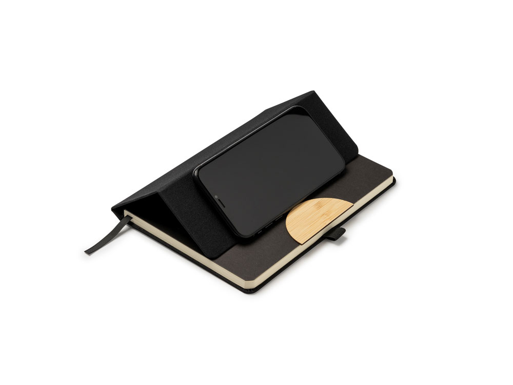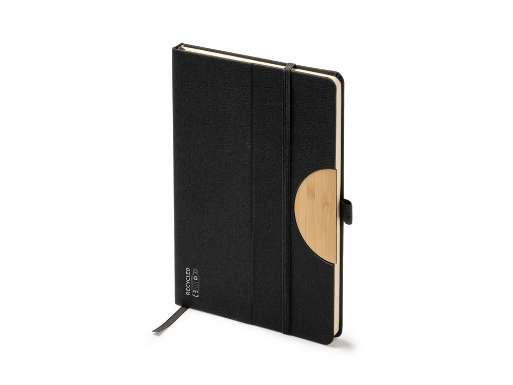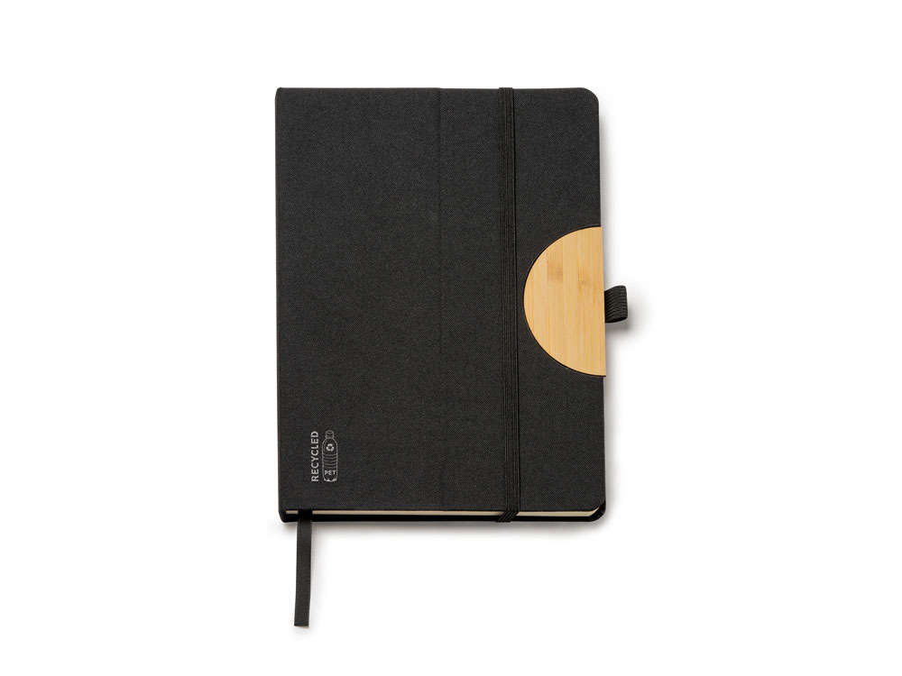 (доставка 6-9 рабочих дней)Блокнот формата А5 с жесткой обложкой из RPET с функцией подставки. Эластичная застежка, закладка и держатель для ручки. 80 листов.