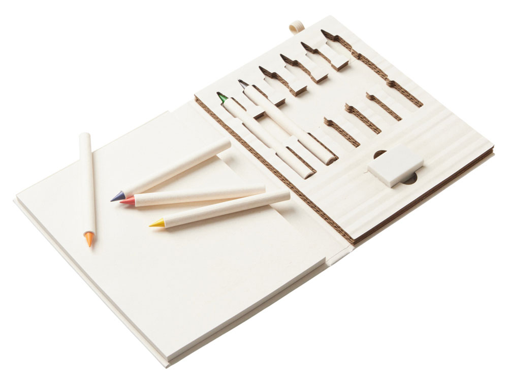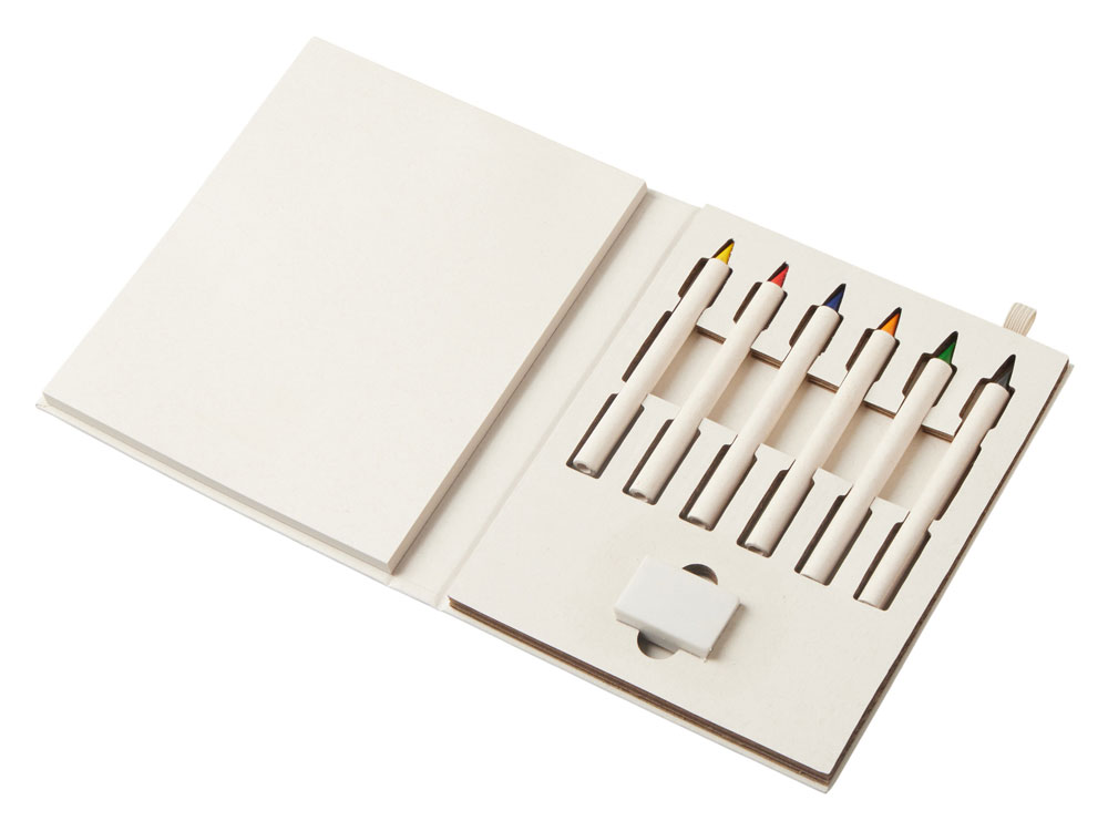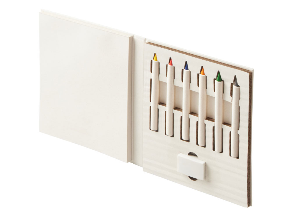 (доставка 6-9 рабочих дней)Набор для рисования из переработанных тетра-паков. Внутри 6 цветных карандашей, ластик и пустые листы для рисования.