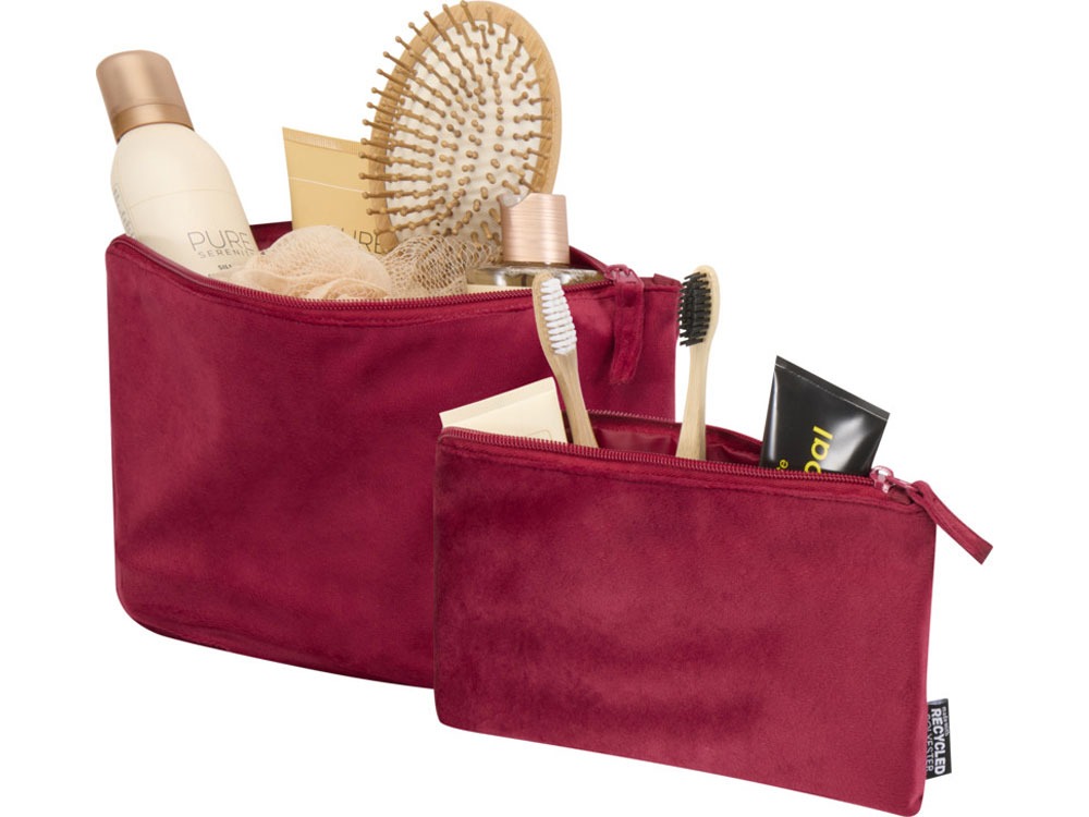 Набор из 2 косметичек, изготовленных из переработанного бархатного полиэстера. Полиэстер имеет сертификат GRS. В комплект входят одна большая и одна маленькая косметички. Легкие, прочные и удобние для хранения косметики или электроники. Большая сумка имеет размер 32 х 21 см, а маленькая 23 х 13 см.