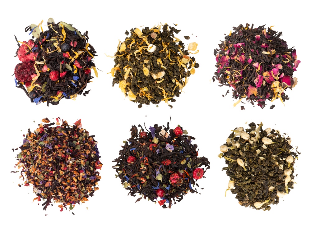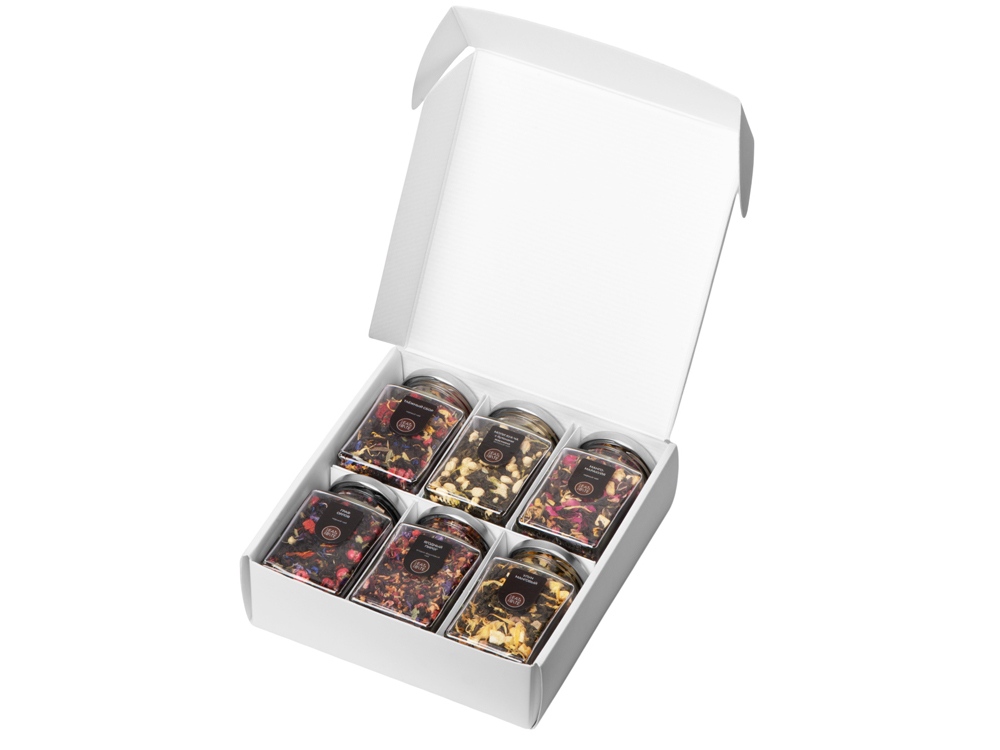 | Комплектность | чай манго-маракуйя черный, таежный сбор черный, манговый улун черный, моли хуа с бутонами жасмина зеленый, ягодный пирог травяной, граф Орлов черный |