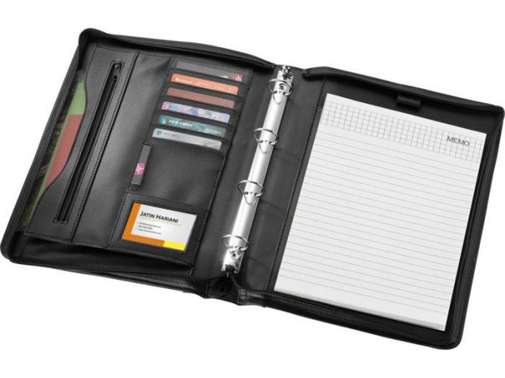 Папка с ручкой, застежкой-молнией, регистратором, карманом на молнии и отделениями для документов. Включает блокнот А4 с 20 страницами линованной бумаги. Ручка и принадлежности не включены.