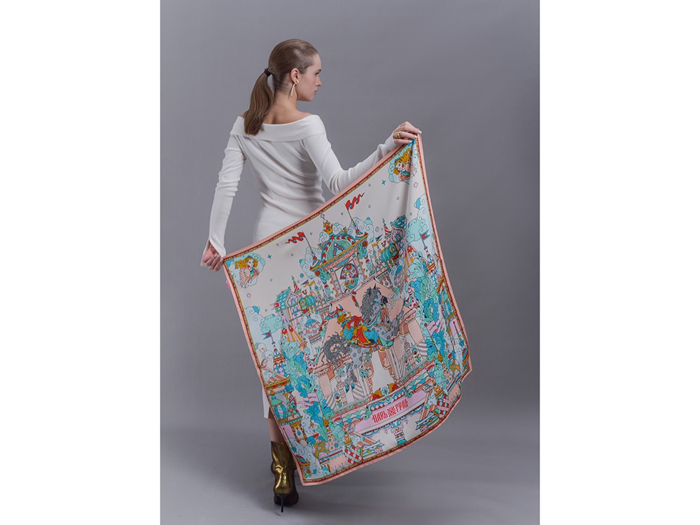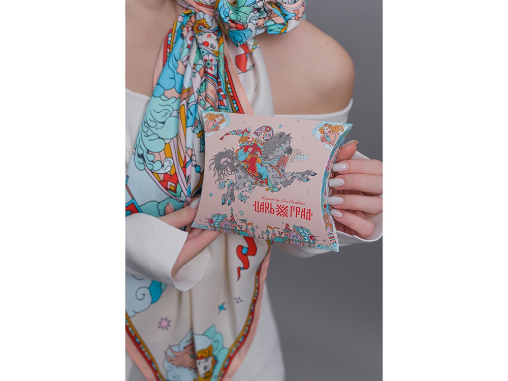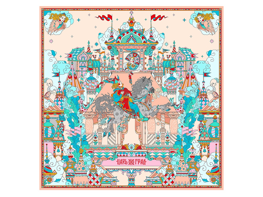 (доставка 6-9 рабочих дней)Платок «Царьград» создан в партнерстве с одноименным загородным курортом, где чтут лучшие обычаи русского гостеприимства. Дизайн платка обращен к воплощению народной традиции чародейства и сказки. Сюжет иллюстрирует фольклорную сцену из произведения «Сивка-Бурка» о победе истинного чувства и исполнении желаний.