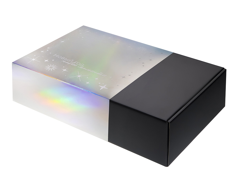 Подарочная коробка из прочного микрогофрокартона, кашированная бумагой с матовой ламинацией, выглядит элегантно и надёжно защищает содержимое. Новогодний голографический шубер с мерцающими серебристыми переливами придаёт ей праздничный блеск и делает каждый подарок по-настоящему особенным.