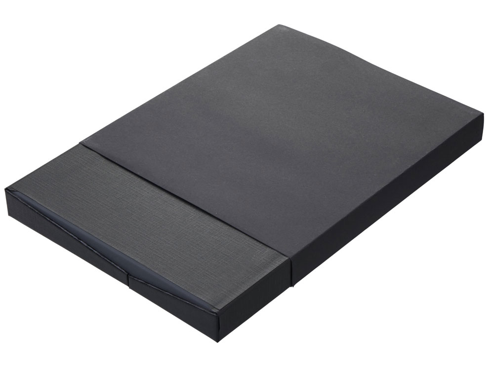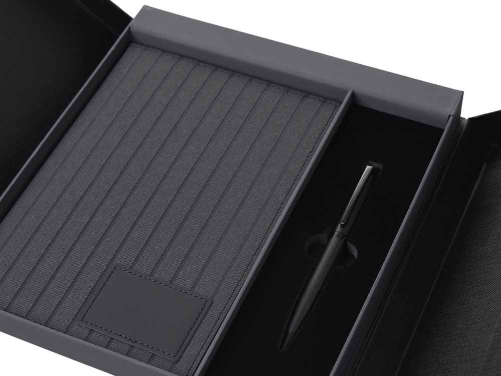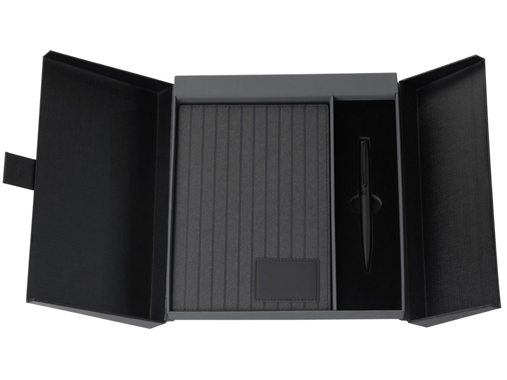 (доставка 6-9 рабочих дней)“Bradbury & Co” – это элегантный подарочный набор, упакованный в красивую коробку на магните. Внутри — блокнот в обложке из рифленой экокожи и металлическая шариковая ручка. Ручка гармонирует с блокнотом за счет рифленой нижней части, а блокнот имеет специальный патч для нанесения логотипа (который можно также нанести на более ровную поверхность на обороте блокнота) и ляссе-закладку для удобства. При гравировке на ручке вскрывается эффектный серебристый цвет.