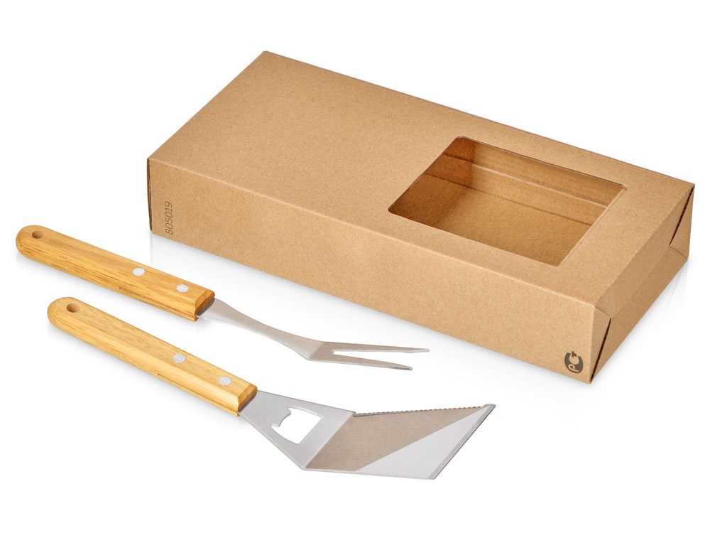 Приборы выполнены из нержавеющей стали, ручки — из дерева: не только не дадут обжечь руки при готовке, но и могут стать дополнительным полем для нанесения.