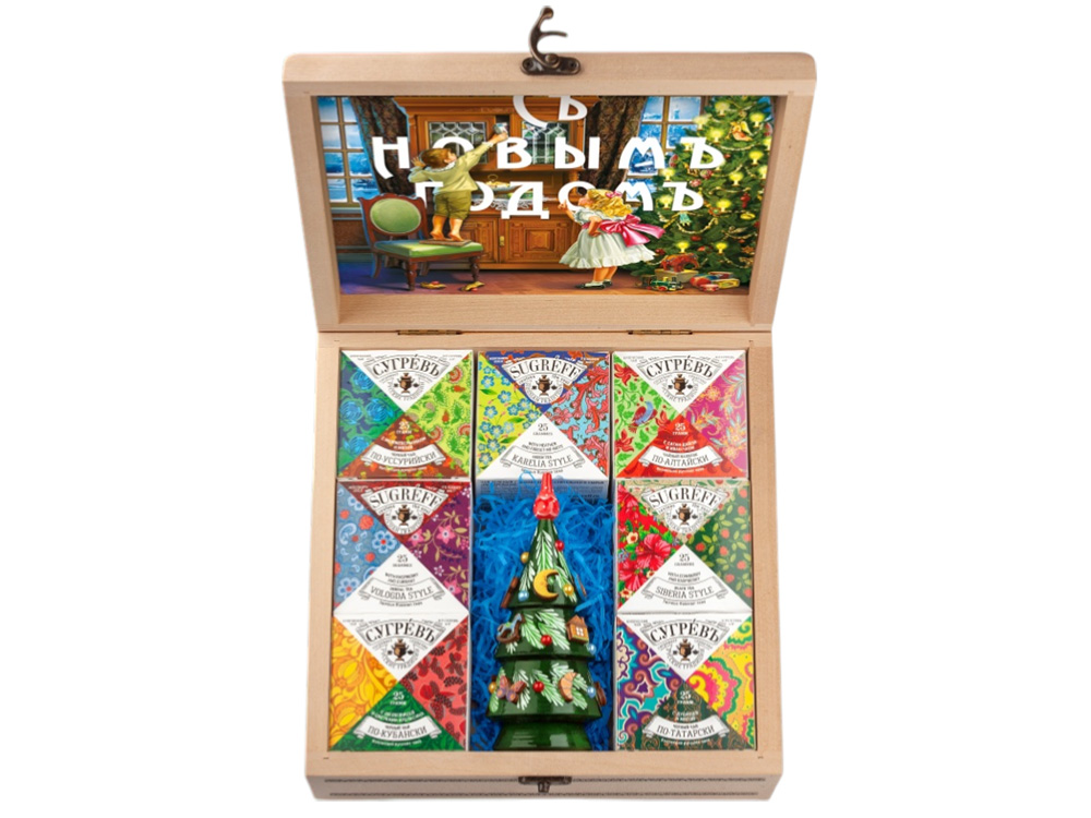 (доставка 6-9 рабочих дней)Подарочный набор из семи эксклюзивных купажей листового чая, характерных для разных регионов России и елки ручной работы с натуральным вареньем, в сувенирной шкатулке из массива берёзы.